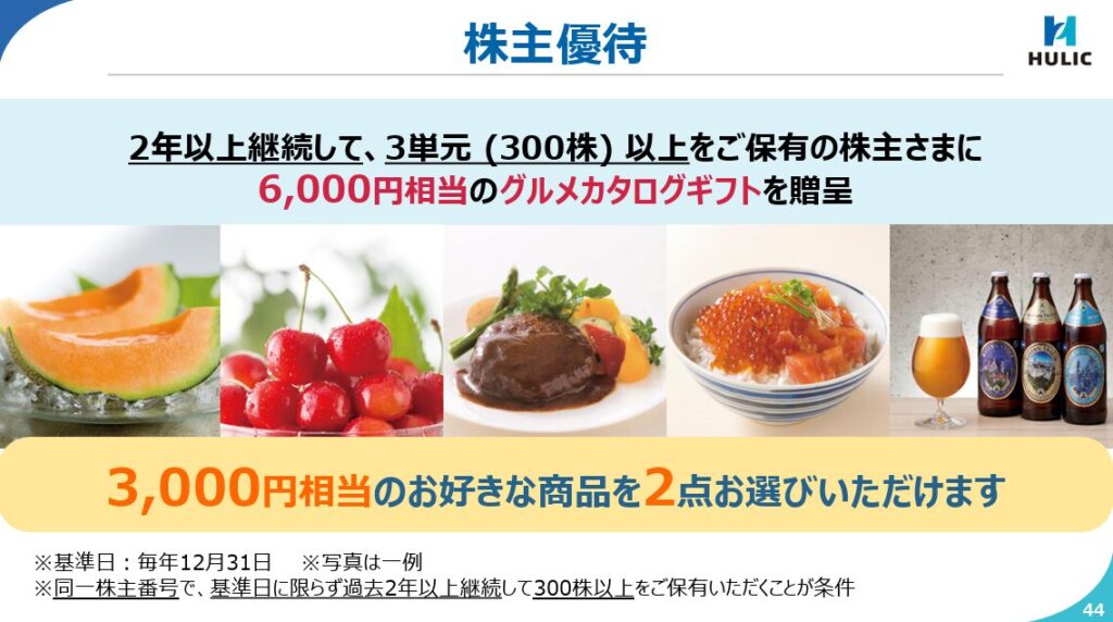 ヒューリックは、基準日(毎年12月31日)までに3年以上継続して300株以上保有する株主に対し、株主優待の権利を与えています。