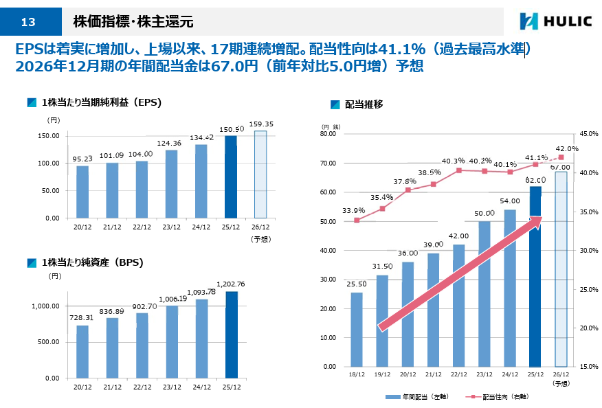 ヒューリックは不動産賃貸事業がメインなこともあり、株主への利益還元を狙いとして、安定した配当を継続することを基本方針としており、2025年12月時点では17期連続増配を達成しています。